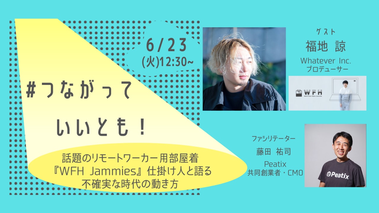 由Peatix Japanx主辦的線上活動『つながっていいとも(歡迎連線)』當中,我們團隊的Makoto Fukuchi透過連線方式擔任主講人,介紹專為連線工作(work from home)設計『WFH Jammies』